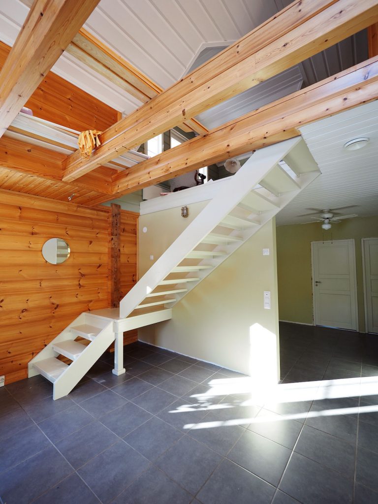 对于楼下走廊的石膏板墙和彩绘石墙,我们使用了泰克诺斯BIORA AIR涂料,这是Teknos的室内涂料全新研发的除醛产品。它能持续净化房屋中的室内空气,这是基于涂料中的特殊官能团因子,与醛类结合,能够产生不可逆的化学反应,将醛类分解成无害的水,从而使空气质量得到改善。它是一种哑光水性涂料,目前已经获得了芬兰M1、北欧白天鹅等国际权威认证,可以放心在室内使用该涂料。