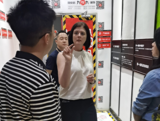 随后,大家前往南山国安居装饰公司,集团建筑涂料商务总监Michelle Buckland米歇尔对中国装饰公司的产品体系、施工标准、服务体系等多方面进行了考察与了解。
