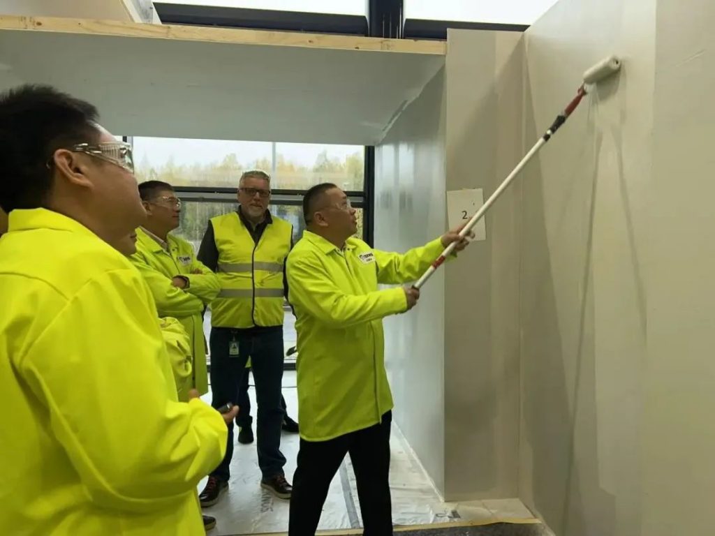 在参观过程中,泰克诺斯集团相关负责人带领申酉信高层团队进行沉浸式产品测试与涂刷,大家感受到了不同光泽度、不同功能性产品之间的差异与特性,申酉信集团副总裁陈贤清先生在亲自涂刷体验后,深切的感受到不同地域施工工艺的碰撞与交融。