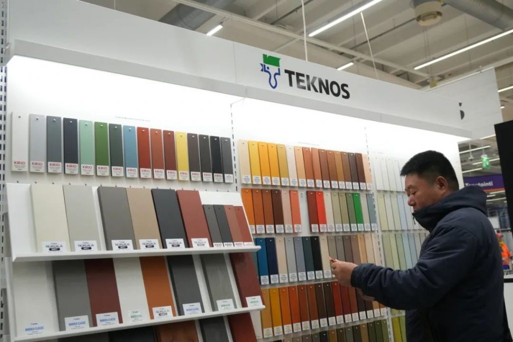 第一站到达的是泰克诺斯位于芬兰赫尔辛基RTV-Yhtymä Oy集团(是一家家居建材一站式购物商城)内的K-Rauta门店。走进其中,整齐排列的涂料产品、色卡以及施工工具贯穿于整个展厅,透过井然有序的空间布局,自助式采购的陈列模式,仿佛看到了北欧人绿色消费理念的具象化表现,这与泰克诺斯的品牌文化不谋而合,始终提倡和践行低碳、环保、可持续生活方式。
