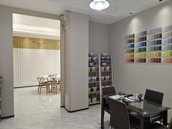 哈尔滨哈西红星店纵深很大,有不同的展示空间,从整齐排列的色卡墙、产品陈列到雕刻着立体图案的装饰线条,每一处都充满独特的美感。