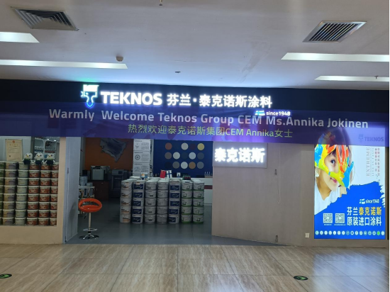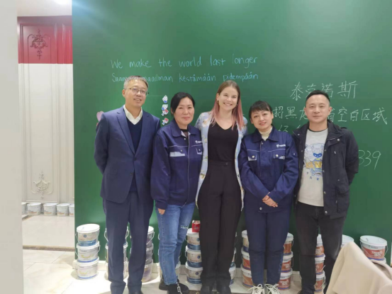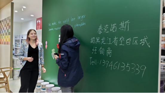 哈尔滨居然店有一面墙专门作为涂鸦黑板漆 SALAMAA BLACKBOARD的展示,泰克诺斯集团CEM Annika女士在现场亲自测试了产品的耐擦洗性能。她表示:泰克诺斯涂鸦黑板漆的产品力在国内外受到了广泛的市场好评,但精湛的施工技术也是其中不可或缺的重要环节。参观过程中,她对于中国经销商的施工工艺给于了高度的评价。