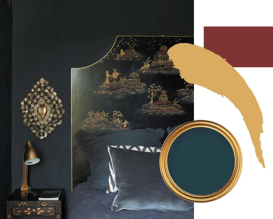 如果要选择三种颜色进行搭配,则有三种搭配方法可供选择:第一种搭配方式:以一种颜色作为主要的基色,另外两种其他的颜色作为配色。首先在色轮上选择主基色,并在相对的一侧选择另外两个辅助颜色。正如在下方的卧室壁画中,深红色与金黄色的微妙引入为整幅画面增添了色彩,并防止了画面色彩过于单调。